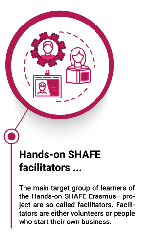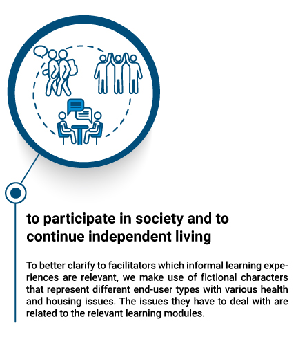 In the scheme below, six characters are identified. They are based in the so-called personas used within other European research projects, such as Blueprint, PHArA-ON and GrowMeUp and adapted to Hands-on-SHAFE. Their main issues have been indicated and linked to the relevant learning modules and experience: